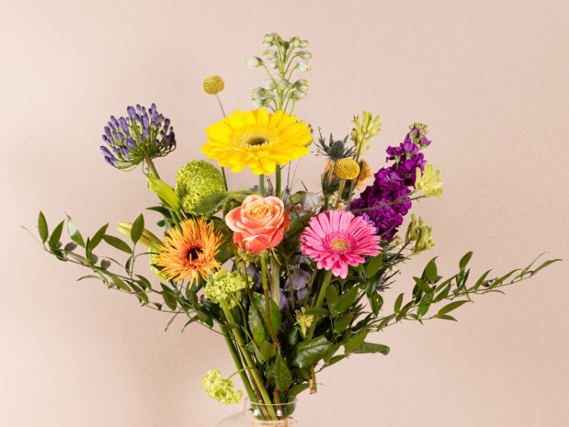 Fris en speels plukboeket met diverse tinten, losjes geschikt met hoogteverschil en open uitstraling.